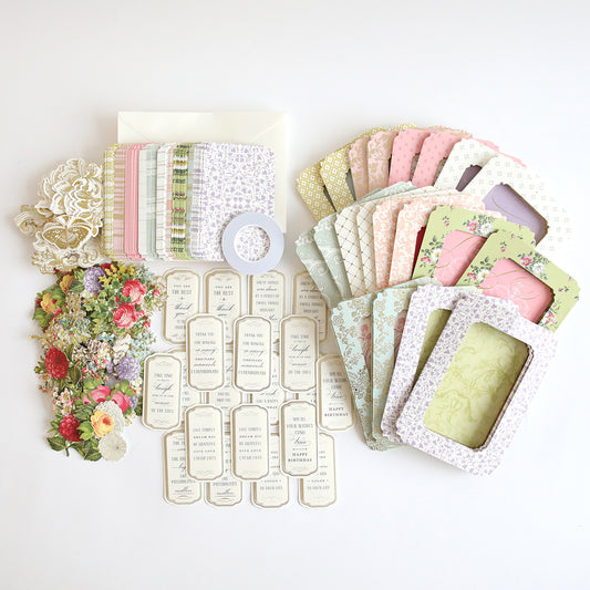 Each card kit is filled with a delightful assortment of exquisite materials, including elegant card bases, decorative papers, die-cut shapes, embellishments, and often a stamp set or sentiments to add that perfect finishing touch. Everything is carefully selected to complement each other, so you can create with ease and confidence.
